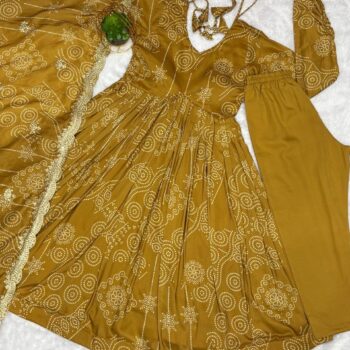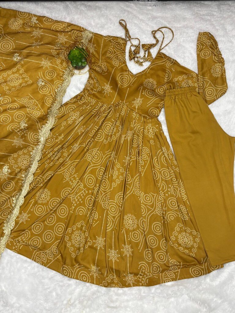 Anarkali Fabric: 🌸 Pure Soft Muslin Bandhej Print with full micro cotton inner – gentle on skin, rich in feel